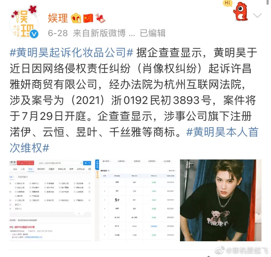 黄明昊开庭事件指的是在2021年7月29日,黄明昊起诉许昌雅妍商贸有限公司侵犯其肖像权一事,这次开庭是黄明昊团队首次维权,所以被其粉丝看的比较重要。