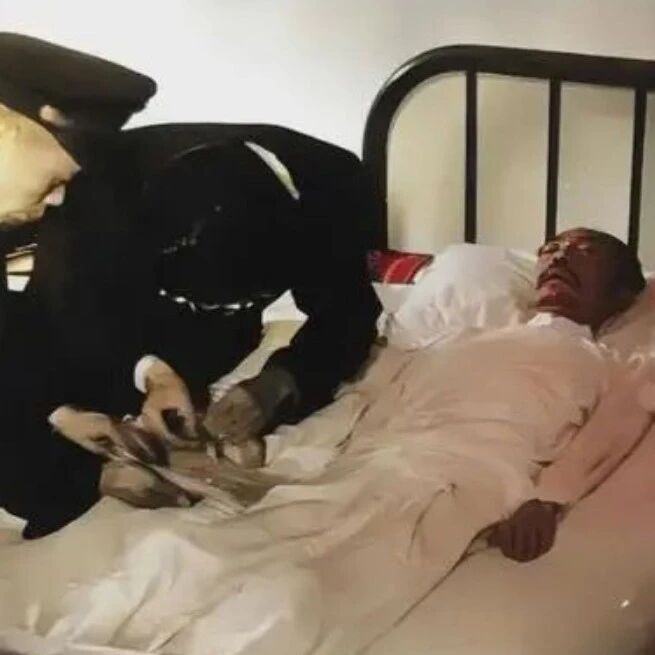 1948年,大汉奸周佛海,病死狱中,这是留下的一张尸体老照片,镜头中的他,身穿白纱褂短褂裤,口眼紧闭,头发已经长得有一寸多长了,面容消瘦,憔悴不堪,死的时候连一个亲属在身边都没有。