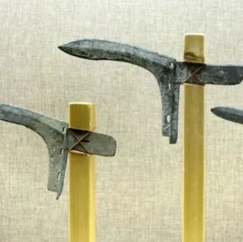 《说文解字》上说:“我,古杀字。”“我”这种武器盛行于商至战国时期,秦以后逐渐消失。根据现藏于故宫博物院西周时期的青铜“我”和现藏于陕西扶风博物馆西周时期的青铜“我”来看,“我”的形状有点像《西游记》里猪八戒扛的铁筢子,只不过“我”是三根齿罢了。“我”是一种短兵器,装上长柄后才能用于战场上砍杀,那尖尖的三角刺砍将下来时,一般的皮甲胄都是难以保全的。