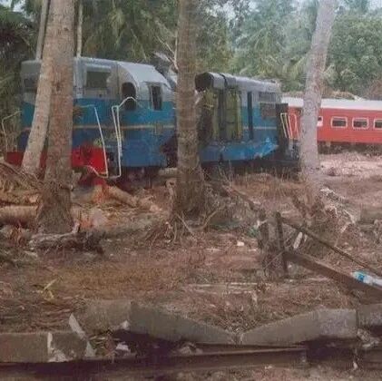 2004年,斯里兰卡一辆火车在海岸附近行驶时,遭到6米高的海啸袭击,8节车厢顿时被冲出轨道,撞向路轨旁的树木和房屋,造成1700人死亡,至今仍是世界上最严重的火车事故。