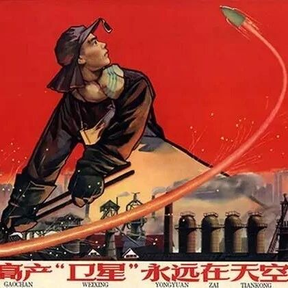 1959年,“宇宙火箭上太空,东风阵阵压西风”宣传画。