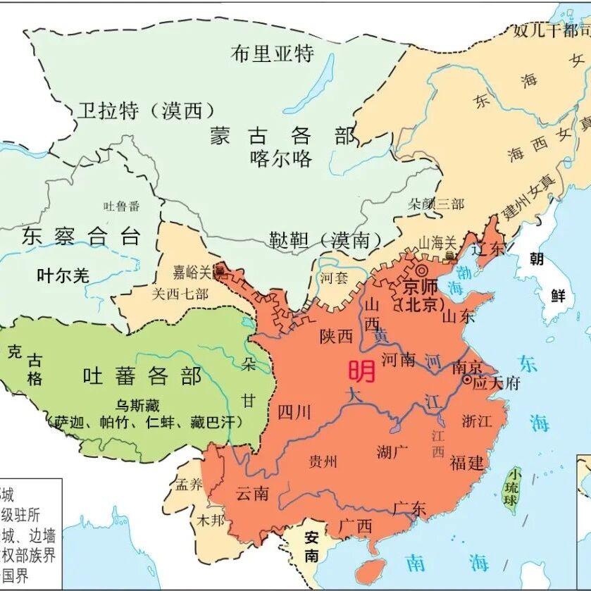 那么,这里我就必须要将明朝的行政区划范围、军事管辖范围以及名义册封地区搞清楚。行政区划范围,在明朝巅峰时期,有两京十四布政使司,在原有的基础上加上了交趾布政司(1407——1428),面积大概为350万平方公里。除了交趾布政使司之外,其他的两京十三省是明朝的基本疆域,这个基本疆域后来被称为“内地”“汉地”,总体处于长城—辽东边墙之南,嘉峪关以东。